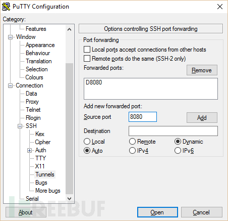 Open PuTTy and load up your VPN server configuration. In the sidebar, navigate to Connection > SSH > Tunnels. Make sure D8080 is included in the list. If not, type 8080 into “Source port” and check Auto and Dynamic. Then hit Add. You now have an SSH proxy running through port 8080. You can save this as a separate session configuration if you want back on the Session tab of the navigation tree.