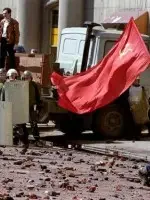 1993年,一场警民间的流血冲突后,一位孤独的示威者兼俄共党员走在遍地石块的街道上。
