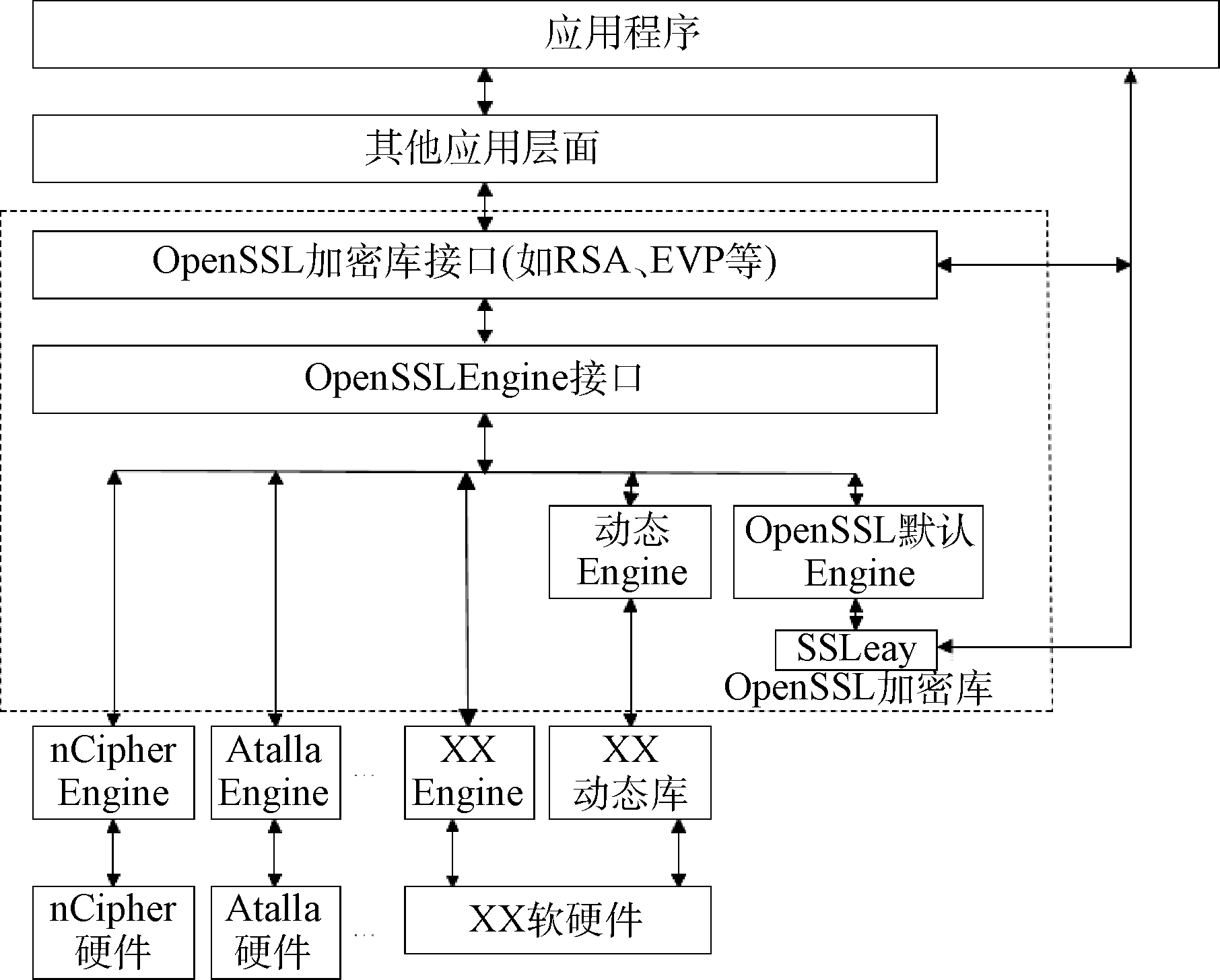 Engine 机制目的是使OpenSSL 可以透明地使用第三方提供的软件加密库或硬件加密设备来加密[10]。OpenSSL 了采用这种机制,并且使得OpenSSL提供了一个通用的加密接口,这样OpenSSL能够与很大部分加密库或加密设备协调工作。