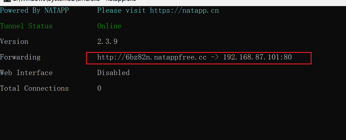 127.0.0.1:80端口开启的 http 服务将被映射到http://n6vit4.natappfree.cc上。 - (至于 http 服务具体做什么,你可以按自己的喜好来。)