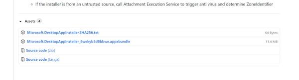 如果你不方便通过 Microsoft Store 进行下载,也可以在 winget-cli 的官方 Github 仓库中直接 在 Release 页面手 动下载 winget 的安装程序进行手动安装。这里需要选择下载后缀为 .appxbundle的软件并双击安装。