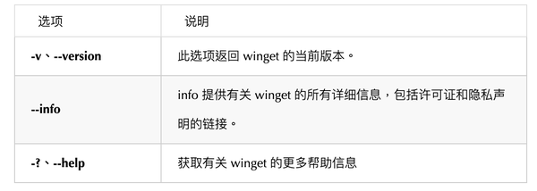 - 显示简略帮助文档:winget -?(-?可选);查看特定命令的详细帮助文档:winget [] -?,如winget install -?
