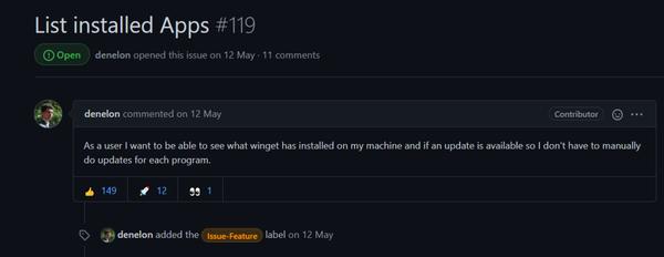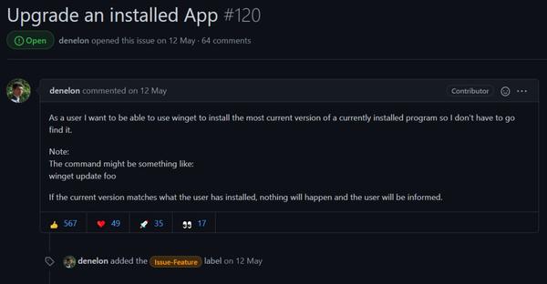 比如,刚提到的 list (列出已安装软件)及 upgrade (升级软件)的功能,也是开发人员回复并落实了用户提出的 issue。