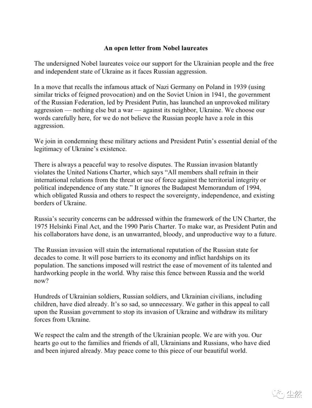 以下签名的诺贝尔奖获者之所以撰写这封公开信,是为了表达我们对乌克兰人民的支持,同时也是为了表达对那些面对俄罗斯的侵略,世界上正在捍卫乌克兰独立自主和追求自由的人士的支持。