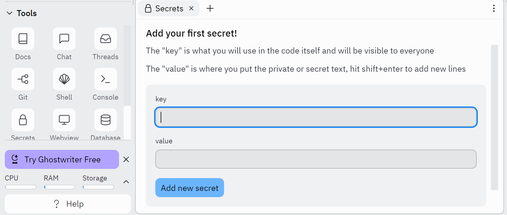2、点击左侧 Tools 菜单中的 Secrets 按钮。添加三个系统变量。 key 值分别为