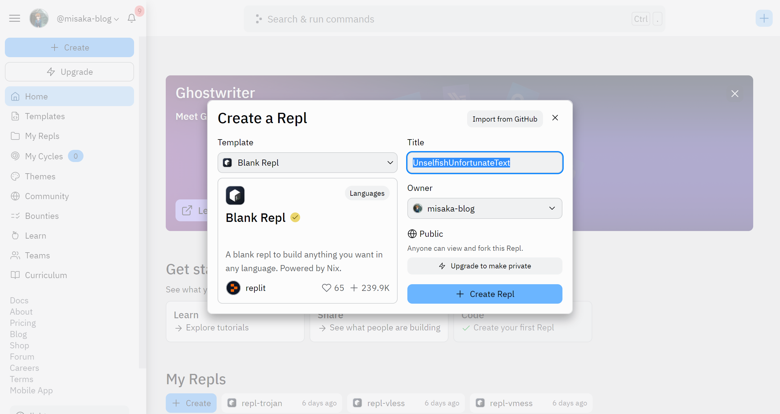 - 在Replit新建一个项目,项目类型选择Blank Repl,名称自己填