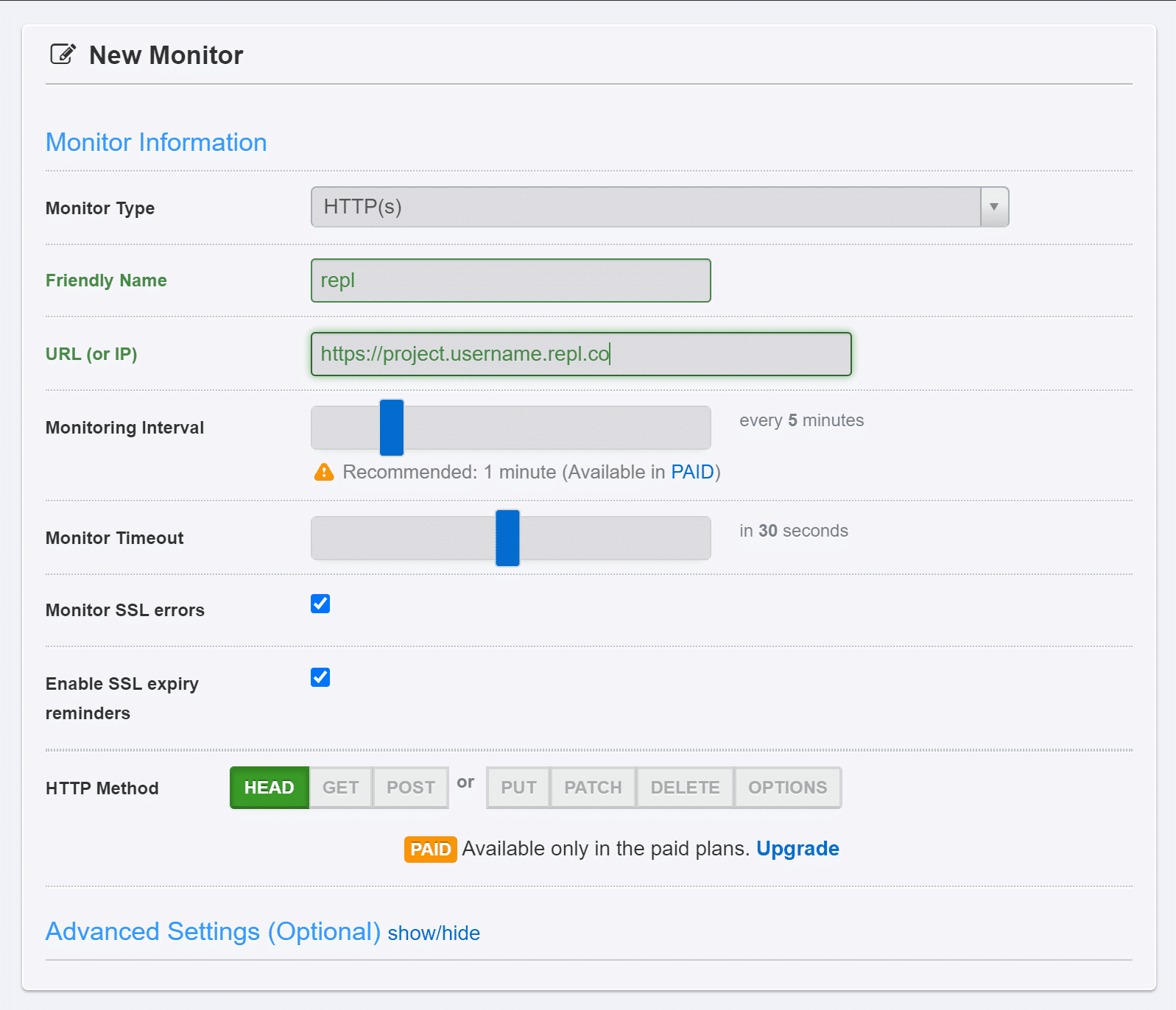 - 按照下图设置监控,名称可随意,监控地址为repl.co的二级域名或自定义域名