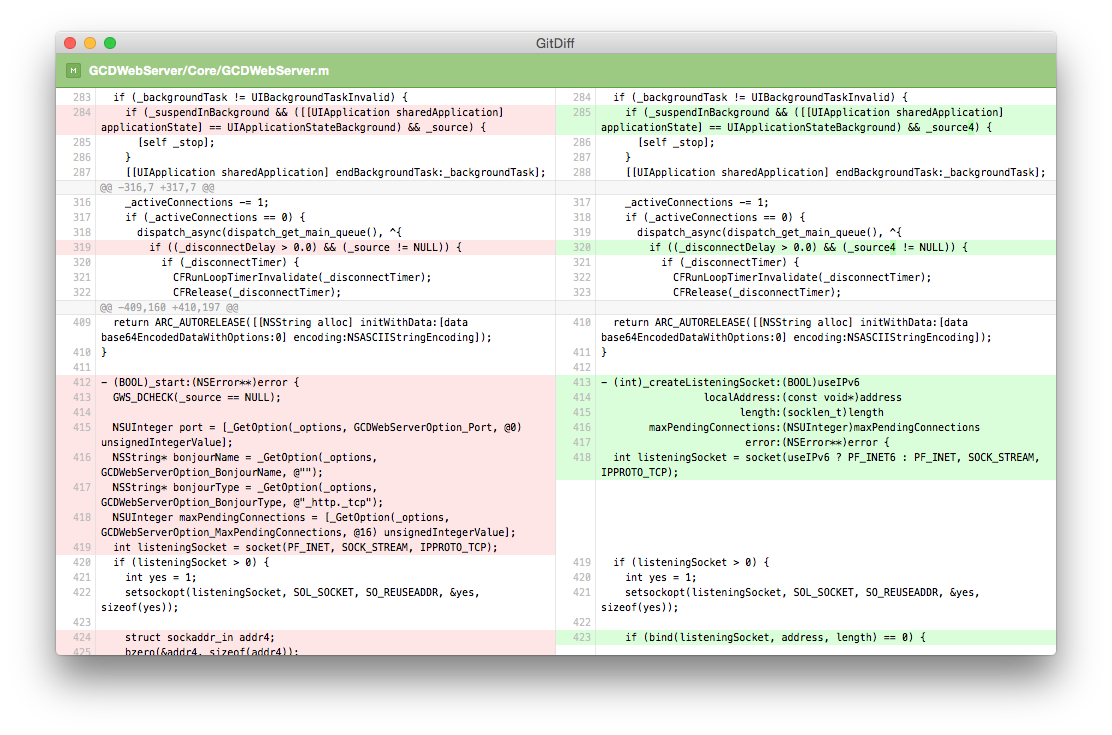 Through GitUpKit, this basic app also gets for free unlimited undo/redo, unified and side-by-side diffs, text selection and copy, keyboard shortcuts, etc...