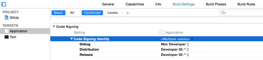 IMPORTANT: If you do not have an Apple ID with a developer account for code signing Mac apps, the build will fail with a code signing error. Simply delete the "Code Signing Identity" build setting of the "Application" target to work around the issue: