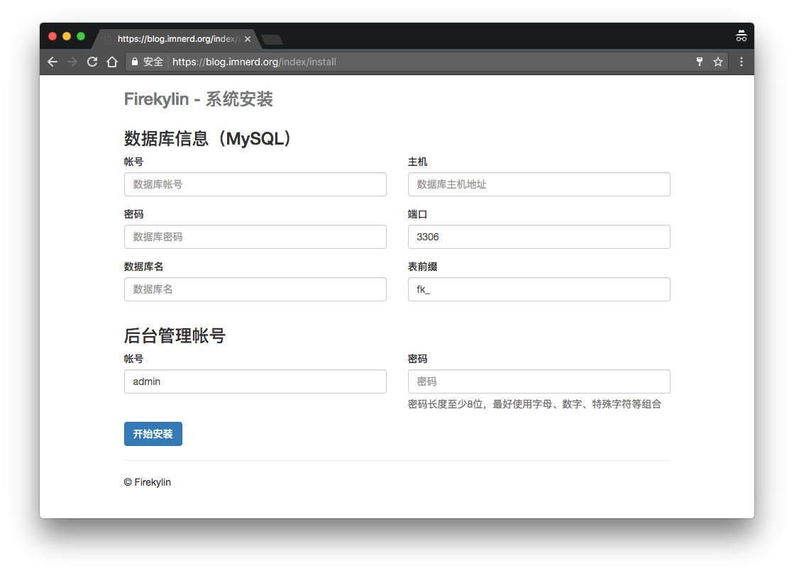 使用浏览器直接访问你的Blog地址即可看到 Firekylin 的安装程序。填入你的 MySQL 信息并设置好管理员账号后点击完成。